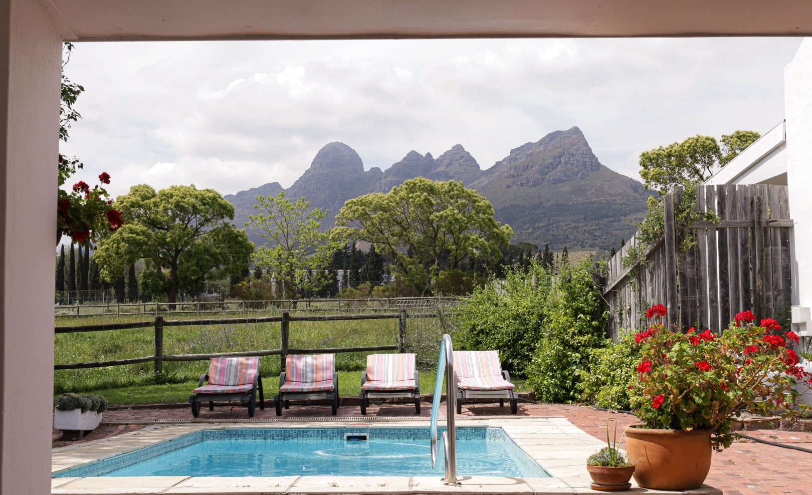 Burgundy CottageBurgundy Cottage is a private cottage with two well-appointed bedrooms, with two en-suite king-size bedrooms, sleeping up to 4 guests. Nestled beside the paddock with views of grazing springbuck, the Helderberg Mountain, and a private pool. Sleeps 4 120 Sq Meter 2 Bedrooms 2 Bathrooms 2 Showers Inside Amenities Wifi Nespresso Coffee Machine Satellite TV Fridge Dining Area Ceiling Fan Washing Machine DishwasherOutside Amenities BBQ/Braai Facilities Mountain View Landscape Garden Outdoor Dining Free Private Parking Private Pool